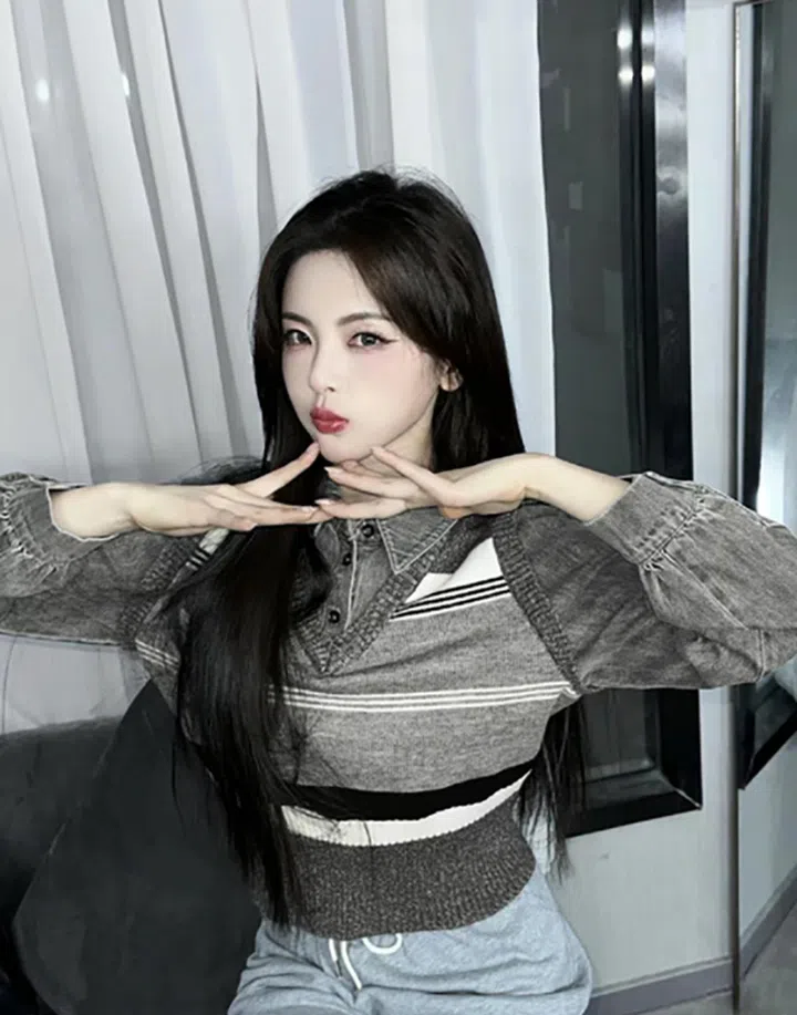杨超越亲自示范:“格雷系”穿搭在简约之余,也可以很可爱噢。灰色牛仔长袖衬衫 + 灰白条纹相间的针织背心的假两件式上衣,再搭配一件休闲的运动裤,她的这身造型十分俏皮动人。