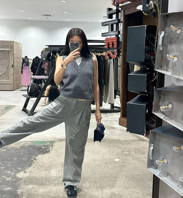 时尚达人Jennie当然早早就尝试了“格雷系”穿搭啦~ 浅灰色的V领背心配上西装裤,然后再以Adidas的球鞋完成造型 —— Jennie穿出了慵懒又随性的感觉,带出来灰色活力的一面。