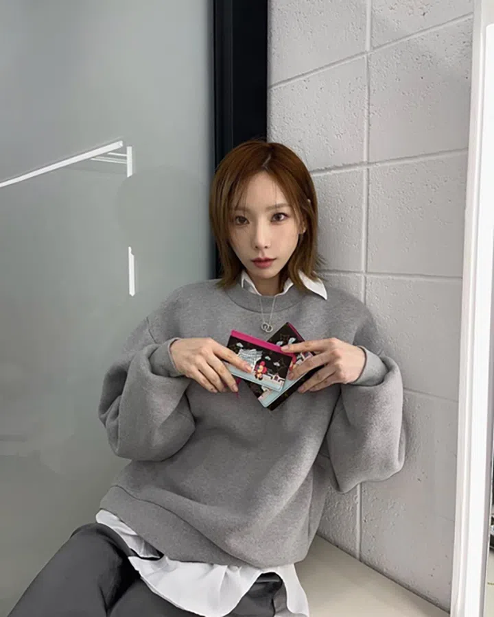 想为你的“格雷系”造型增添一些亮点?那么你可以参考泰妍的穿搭:在oversize的灰色T-shirt之下,叠穿一件白色的衬衫,作为造型的亮点之外也能区隔开上衣&下半身的灰噢。