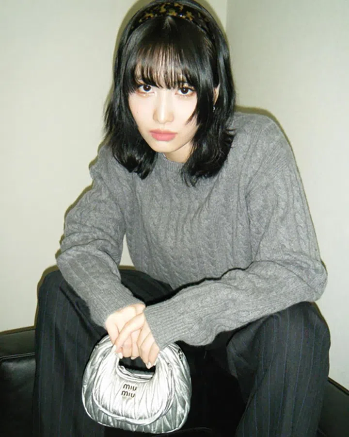 除了上衣/裤子/裙子等衣物,“格雷系”造型的完成也可以从帽子、袜子等饰品入手。穿着灰色棉质长袖上衣 + 同系列短裙的鞠婧祎,也没有放过小细节噢 —— Miu Miu的贝雷帽、灰+白的长筒袜子再配上乐福鞋,她的整体造型可是很有氛围感!