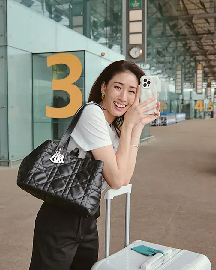 王智荟作为Dior包迷,也抢先背上Toujours新袋搭飞机。并以全身黑白(甚至包括行李箱和手机壳)演绎现代、利落的休闲感造型。