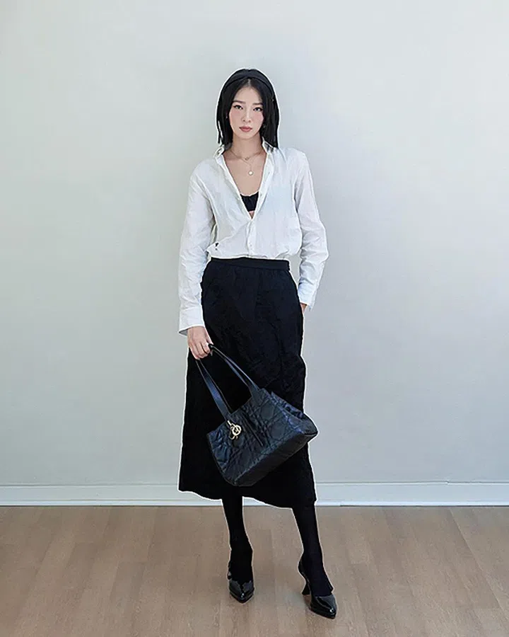 韩国超模Irene Kim穿着Dior秋冬系列成衣,以简约的白衬衣+黑裙的造型演绎Toujours手袋。而且,这种随性敞开领口露出一点bra的造型今季也很流行哦。