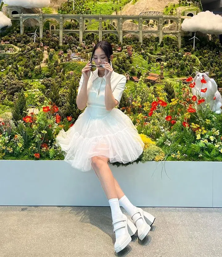 Jennie 在“自家”的Jentle Garden拍照,穿上带有运动风的小洋装、白袜,以及高跟玛丽珍鞋。是不是觉得,她犹如童话故事走出来的角色一般梦幻、甜美?