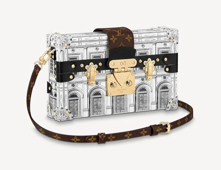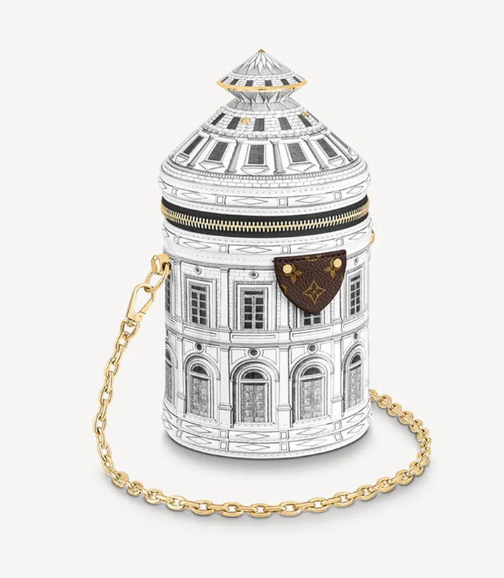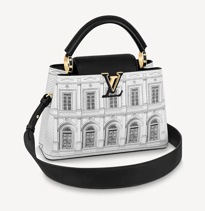 经典的Capucines包是最“值”得收藏的爆款包。这款更印上Piero Fornasetti笔下著名的的意大利建筑错视画,展现了优雅的黑白美感,令“包价“大大升值。