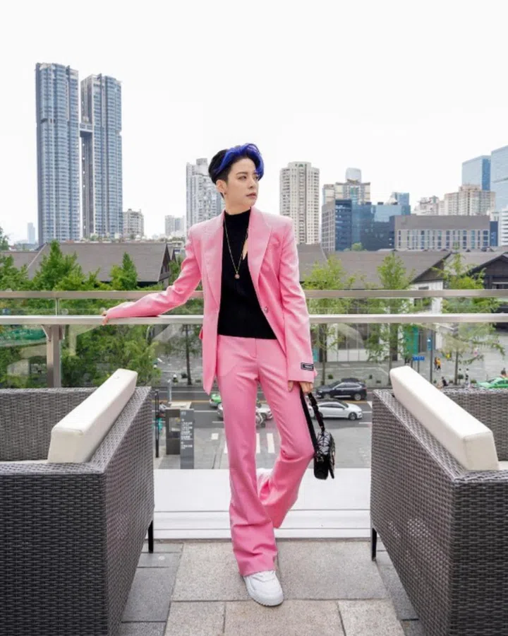 同色系的套装也是你初次尝试“多巴胺穿搭”的好选择哦!你可以参考“新浪姐”刘逸云的粉色西装造型 —— 选择一个“多巴胺色”作为主色调,并适当添入黑、白or灰等中性颜色中和整体造型。