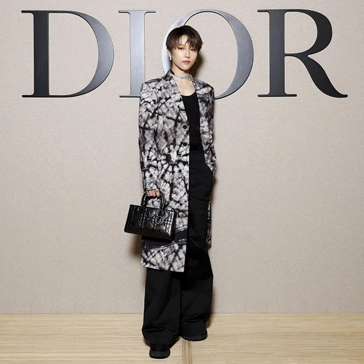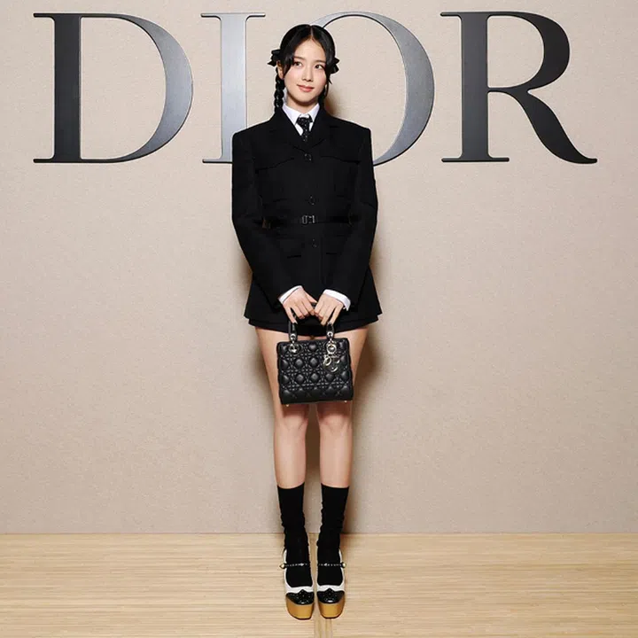 Dior全球品牌大使Jisoo出席品牌2024秋冬时装秀,穿着Dior 2024 早秋系列套装,并携带Lady Dior My ABCDior小型手袋,蝴蝶结发辫造型活泼又俏皮。