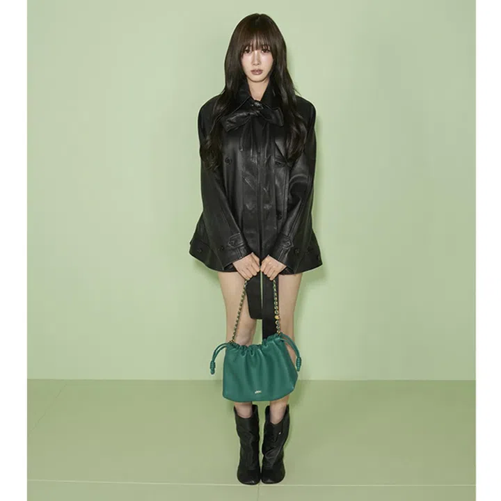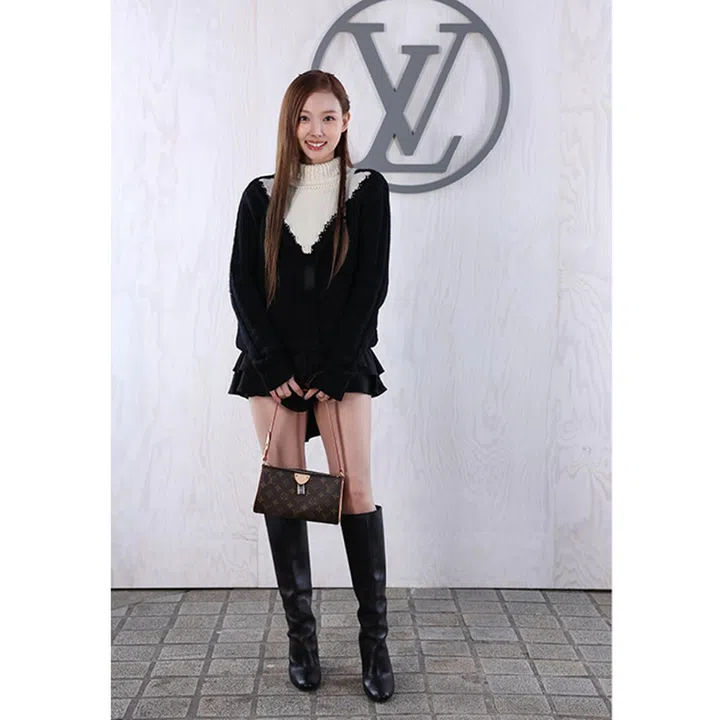Twice成员Nayeon以黑白针织毛衣搭配百褶短裙及长靴,并携带一款轻巧的Louis Vuitton Pochette Tirette肩袋,造型元气十足。