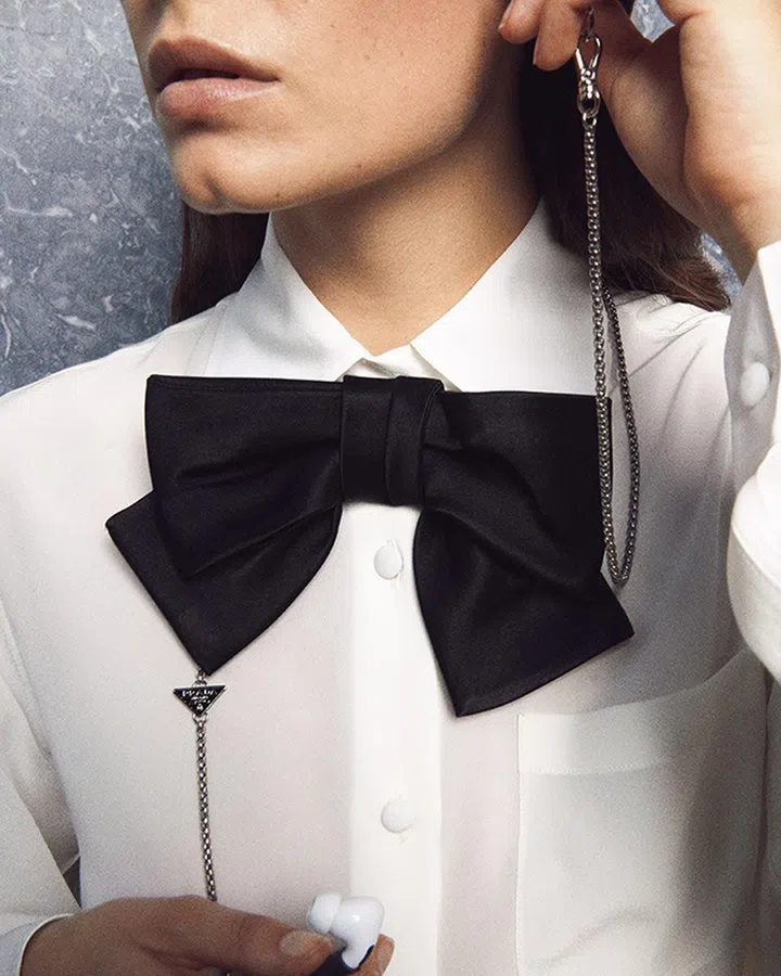 但,当我看见Prada推出这条airpods链饰时(Louis Vuitton之前也推出了一款airpods耳坠),我瞬间被它迷倒。品牌今季大肆翻玩标记性的倒三角形logo,推出一系列三角形徽章式耳坠(无需耳洞的耳夹款我也超心动)、胸针等饰品,而这款airpods链也饰以经典的三角形logo徽章,挂在脖子上也能充当项链。
