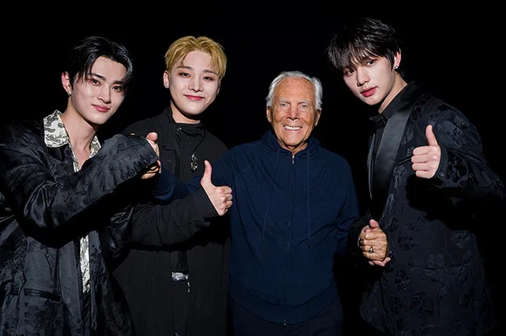 韩国男团Xodiac受邀出席Emporio Armani 2024秋冬女装大秀,其队长Doo Hyun Jo(Lex)及Chun Sing Mak(Sing)、Ngo Yin Lee(Leo)还和Giorgio Armani一起合影。