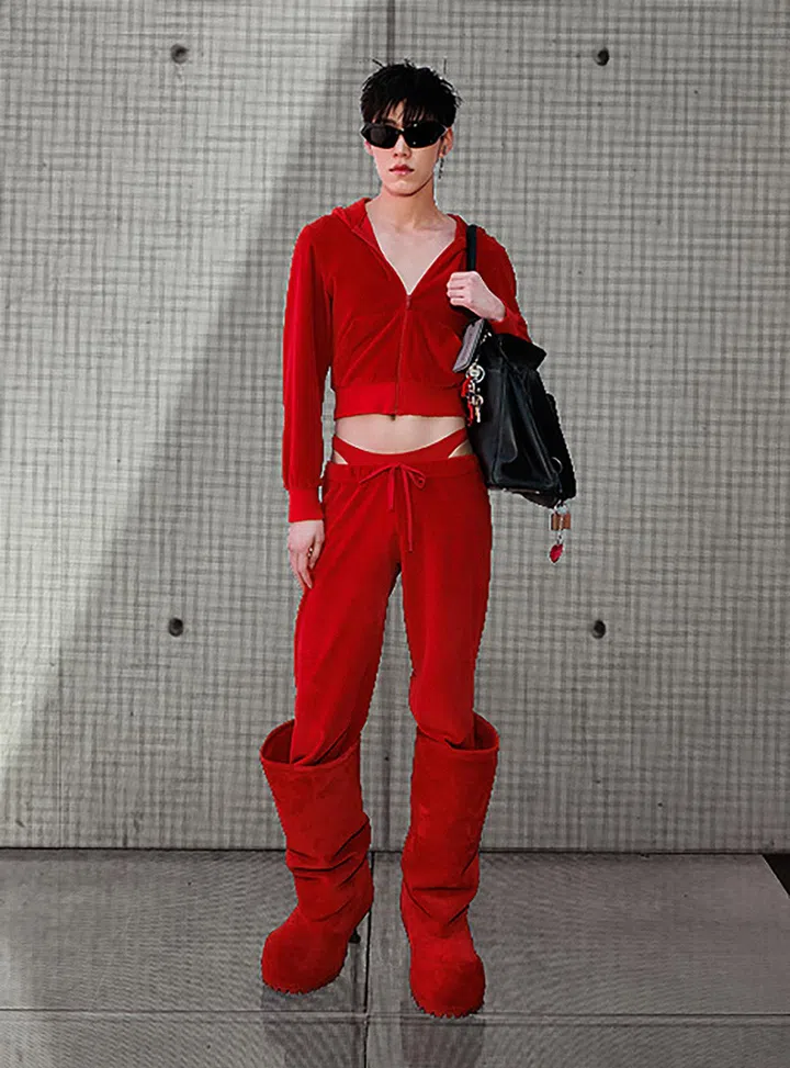 泰星PP Krit出席Balenciaga 2024秋冬大秀,以早秋系列红色丝绒套装演绎Y2K风潮,脚下穿着高跟靴并携带Rodeo肩袋,造型大胆又抢眼。