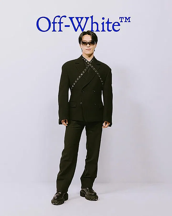 SEVENTEEN成员Dino出席Off-White秋冬大秀,以带个性饰带的黑色西装及墨镜亮相,造型炫酷散发未来感。