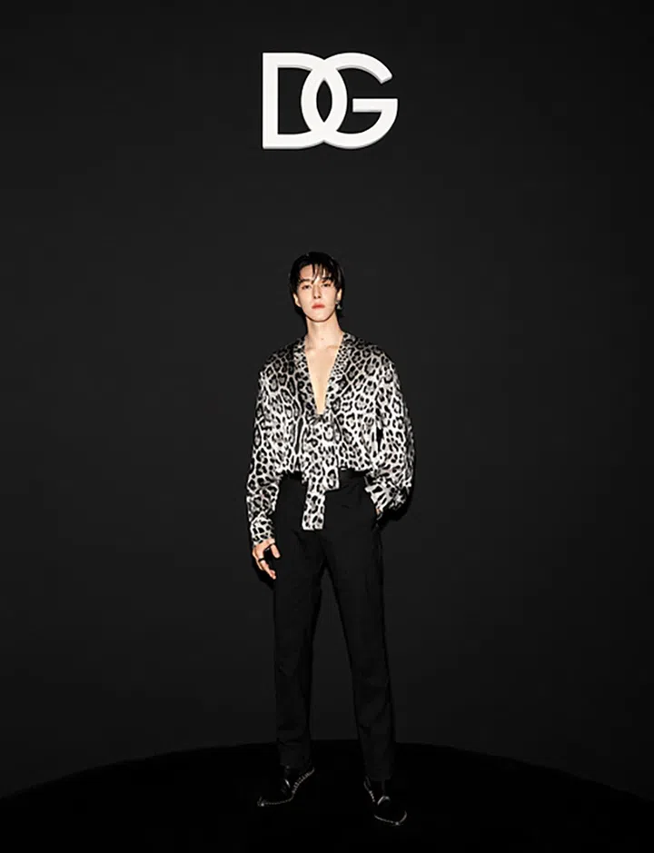 泰星Nani (Hirunkit Changkham),穿着Dolce & Gabbana 2024秋冬男装系列的豹纹造型出席大秀,展现优雅与野性兼具的anti-mancho造型。
