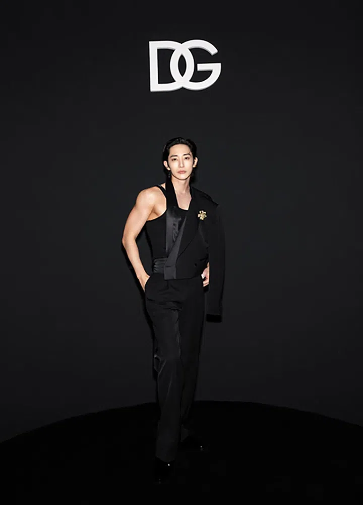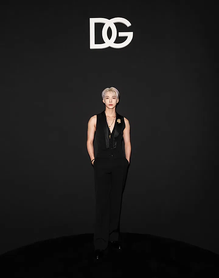 Dolce&Gabbana全球品牌形象大使、韩国NCT成员道英,穿着Dolce & Gabbana 2024秋冬男装系列的无袖礼服造型出席品牌2025春夏男装秀。