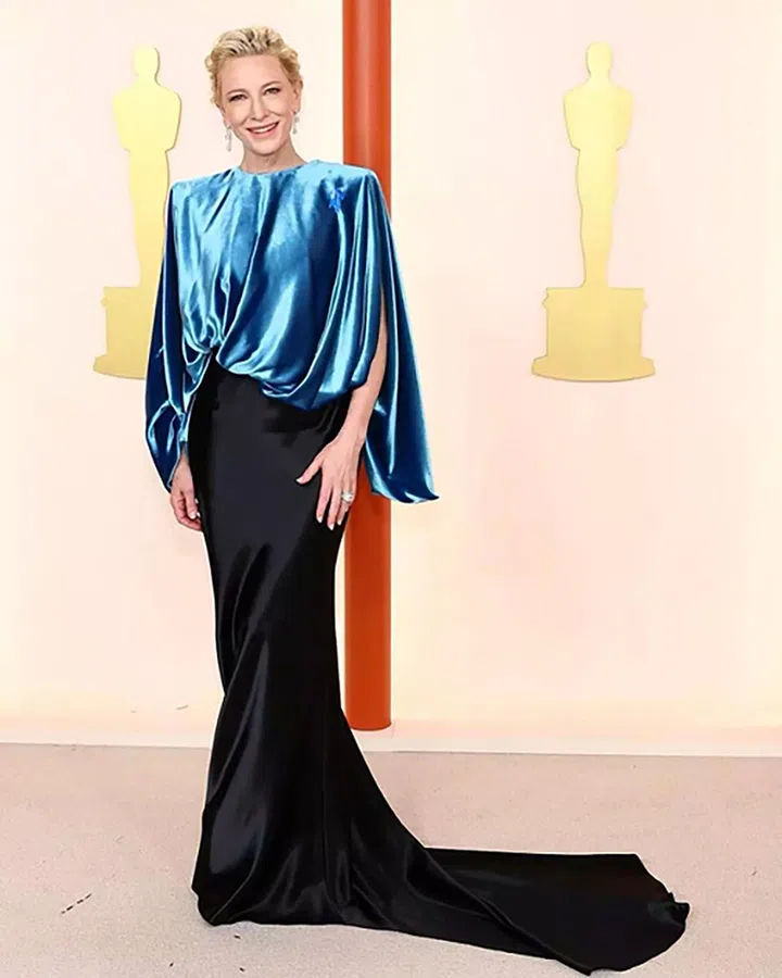 澳籍巨星Cate Blanchett穿着由Nicolas Ghesquière定制的Louis Vuitton蓝色丝绒上衣及缎质长裙,搭配品牌腕表及珠宝艺术总监Francesca Amfitheatrof操刀的高级珠宝。以往Cate Blanchett出席盛典常穿旧衣,这套造型也同样遵循可持续设计理念,上衣来自未面世的馆藏系列,裙装则由可持续桑蚕丝打造。