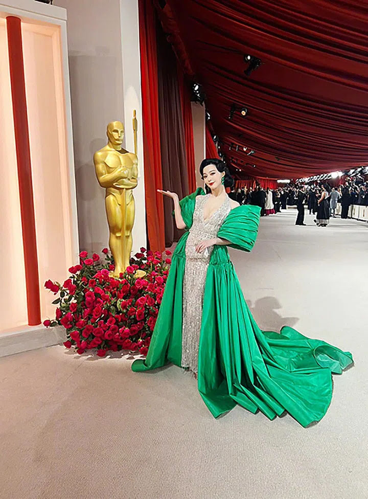 这套出席奥斯卡颁奖典礼观影派对的服装,是来自Miss Sohee 2023春夏定制礼服。该品牌由韩裔新锐设计师Sohee Park创立,她善于糅合传统元素,如将朝鲜民画融入设计。Blackpink巡回演唱会中,也穿着了来自Miss Sohee的服装。该品牌华丽的复古韵调,也格外适合范冰冰的红毯风格。