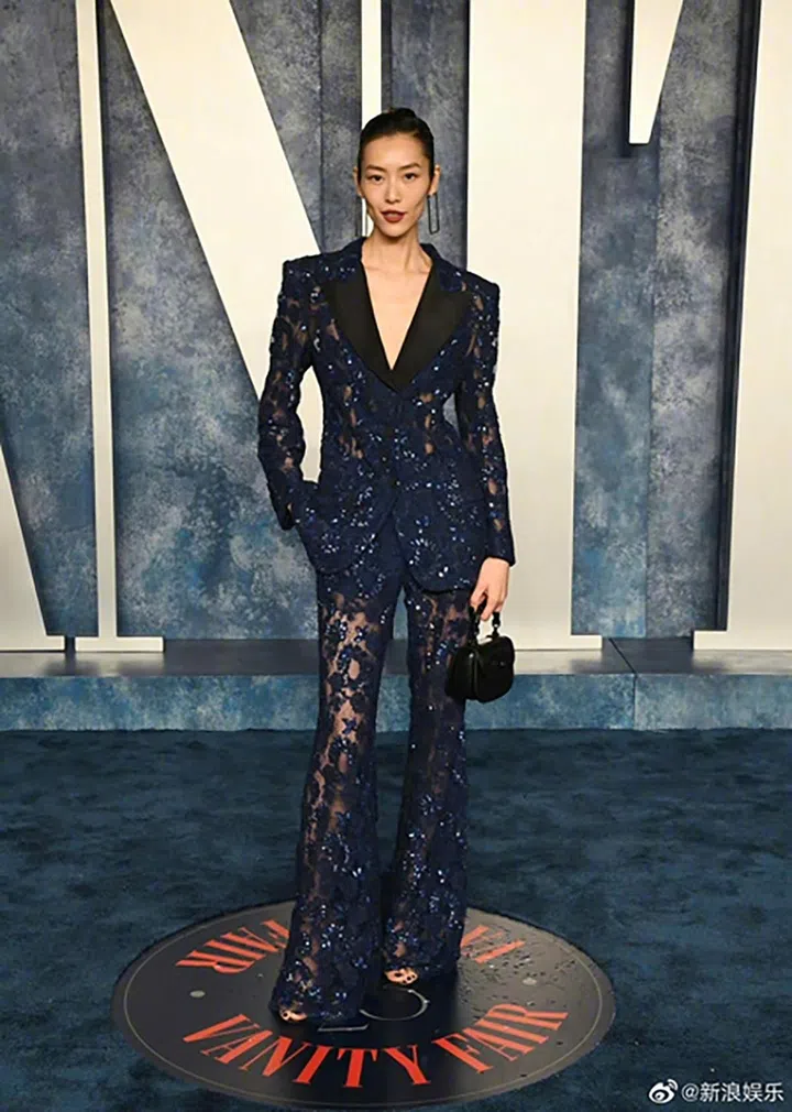 刘雯出席奥斯卡派对,穿着Gucci定制刺绣蕾丝西装搭配品牌Bamboo 1947迷你手袋。以干练发型及红唇展现性感又帅气的超模风范。