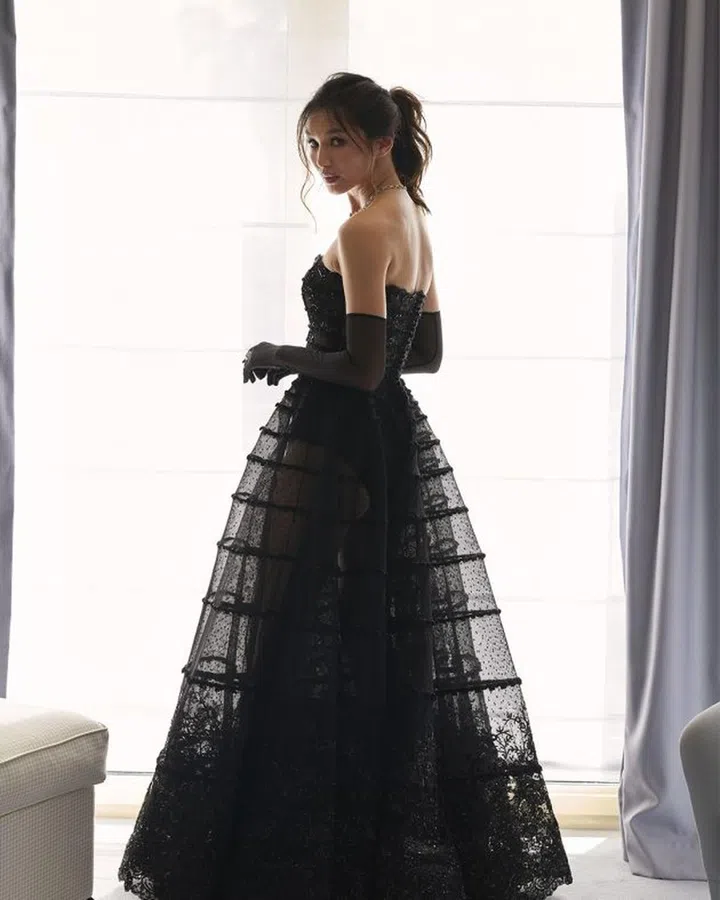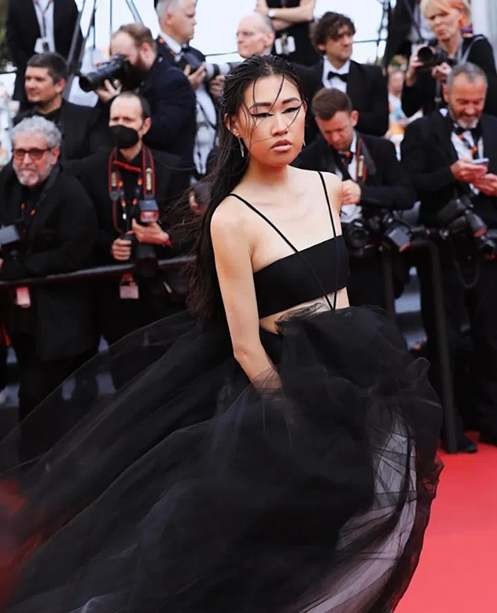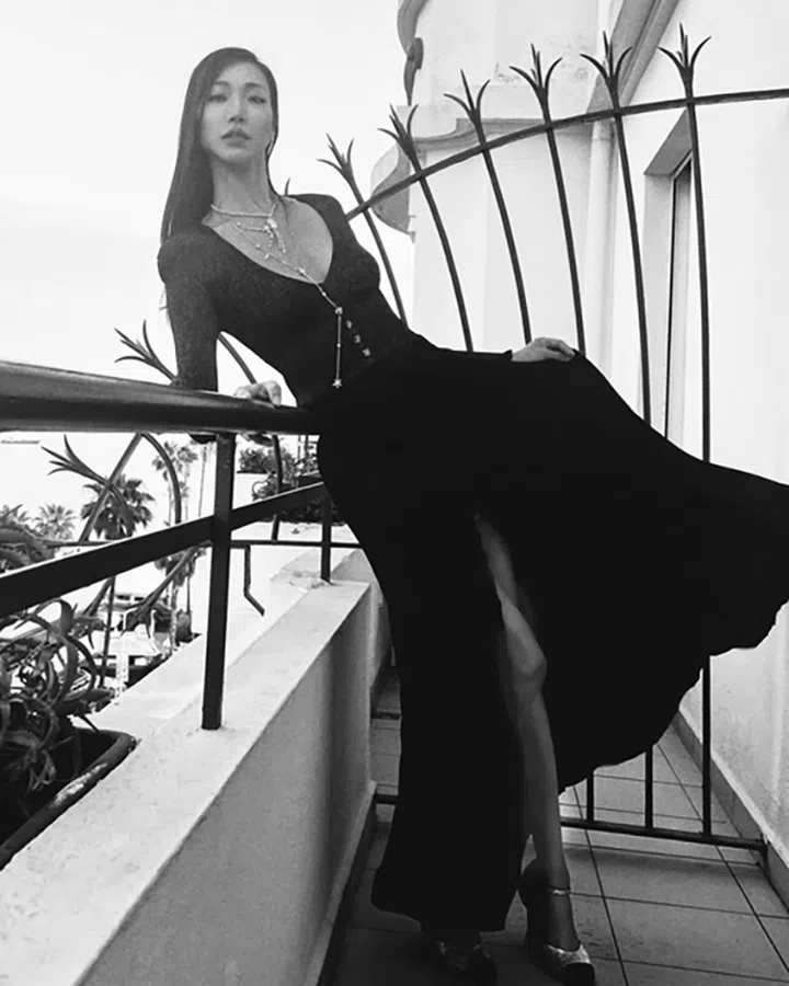 Park Soo-Joo出席影片《三千年的渴望》(Three Thousand Years Of Longing)戛纳首映,穿着一套来自阿尔巴尼亚设计师品牌Nensi Dojaka的超性感薄纱吊带长裙搭配Chopard珠宝。这样的半透明吊带镂空设计,正是Nensi Dojaka的拿手好戏。