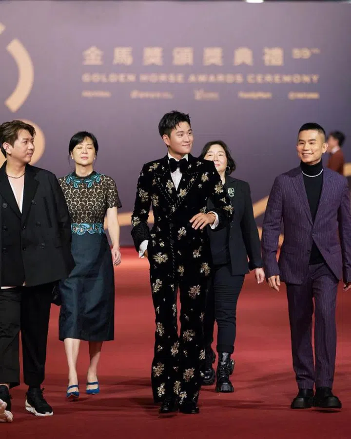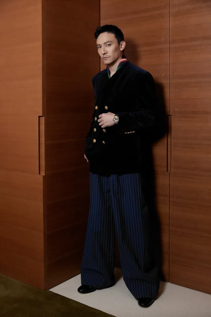 被誉为金马最帅评审的男神张震,这次穿着不同于寻常西服的Gucci秋冬系列(Exquisite Gucci)双排扣绒面外套,并搭配细条纹阔腿裤及贝雷帽,领口的丝巾也是点睛之笔,整体造型完全展现他出潇洒不羁、与众不同的个性。
