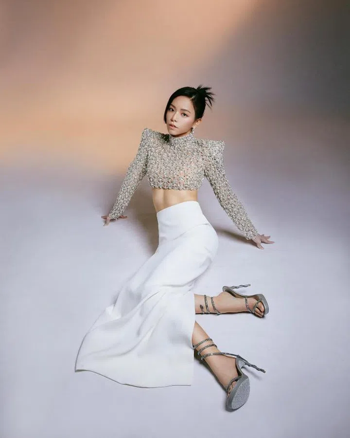 宋芸桦穿着黎巴嫩高订品牌Khaled & Marwan的两件式礼服,上身以缀饰透视短版上衣展现华丽性感,下身以纯白长裙拉长线条。搭配De Beers的London by De Beers珠宝系列,整体造型轻盈又性感。
