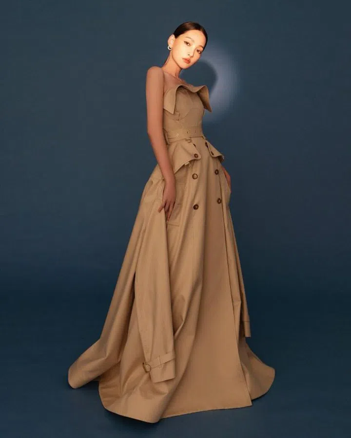 林映唯穿着Burberry风衣礼服裙——该设计亮相于Riccardo Tisci的2022 秋冬女装系列,以紧身束腰设计的礼服演绎品牌经典风衣,该设计别致又显身材,造型绝美令人过目不忘。