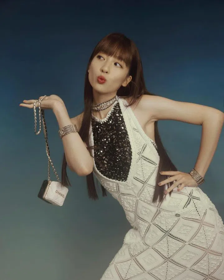 王渝萱穿着Chanel 2023早春度假系列黑白针织长裙,背后以露背设计展露小性感。搭配迷你小包,造型俏皮欢快又不失优雅。