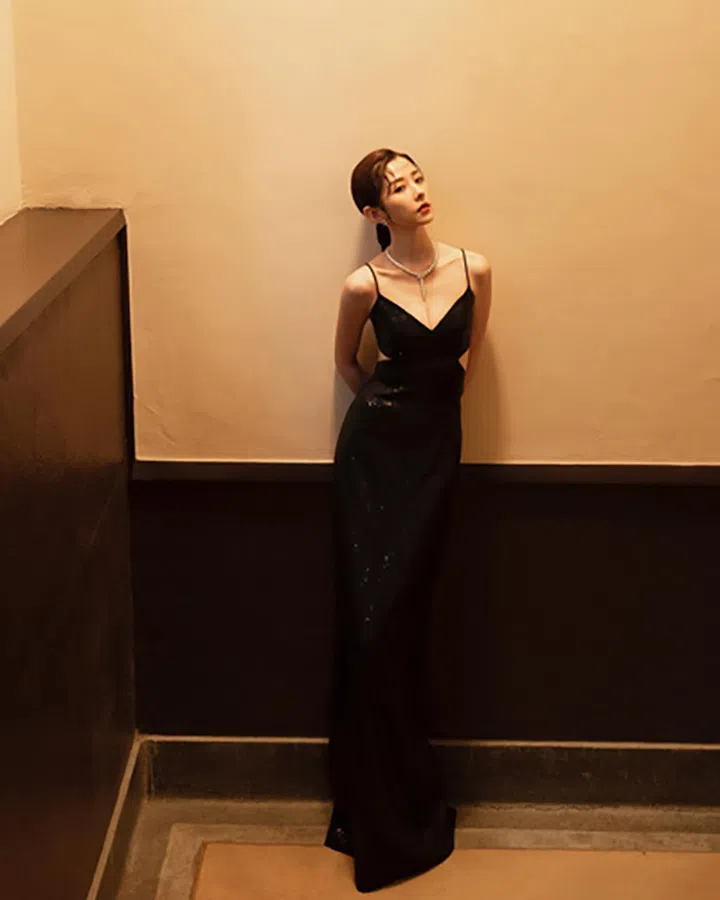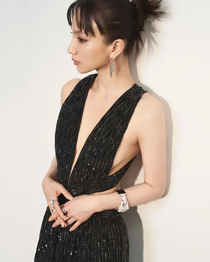 张寗穿着Celine黑色礼服,同样是挖洞露腰设计,亮片缀饰则相对细腻、低调。搭配Van Cleef & Arpels珠宝,造型现代、简约又散发性感魅力,让她自己都觉得“美到冒泡”。