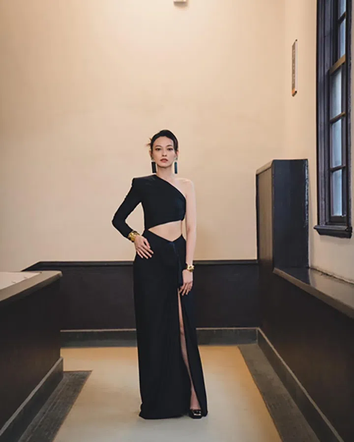 今年台北电影节礼服共同点?不少女星都穿着挖洞和单肩/不对称设计礼服,姚以缇身上这款礼服及鞋履来自Saint Laurent(高跟鞋请看:新YSL女人的必备个性单品),高开衩和露腰设计将她的小蛮腰和美腿大胆展示出来。