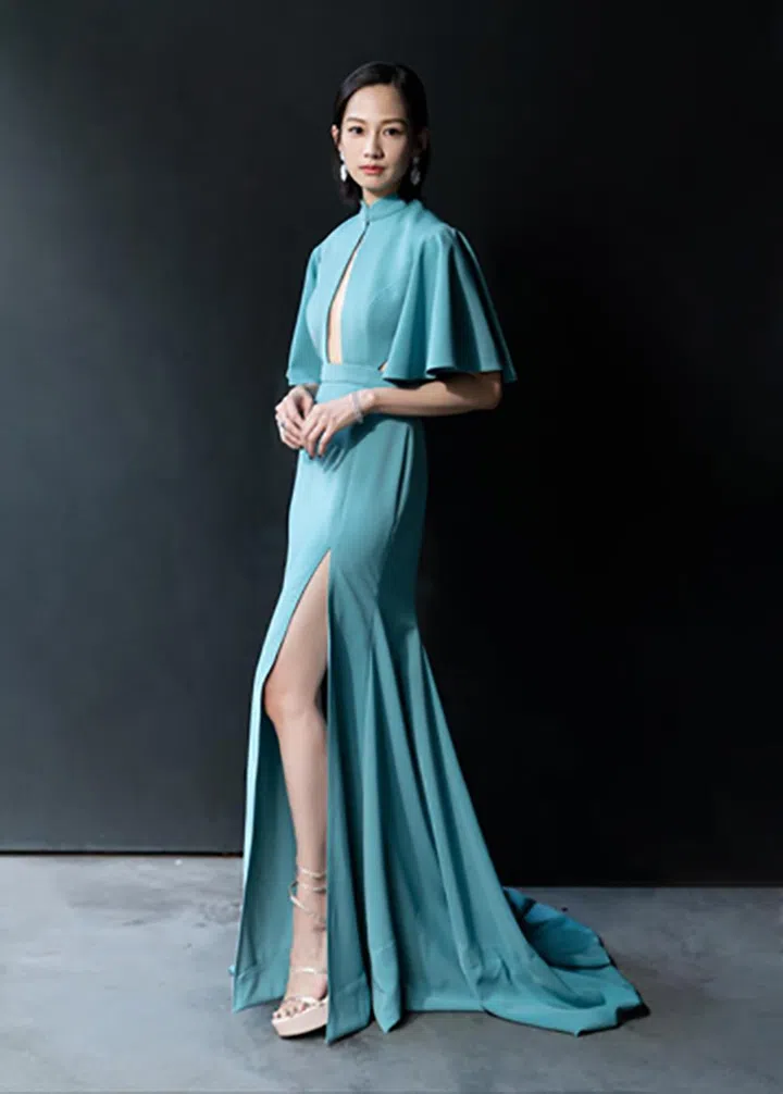 今年担任评审及颁奖人的简嫚书,穿着前胸挖洞,并采用露背及开衩设计的台湾设计师品牌BOB Jian(朱芷莹也穿了该品牌的白色挖洞露腰礼服),并搭配De Beers珠宝及René Caovilla鞋履。转身的时候,还可看见她背后的刺青。