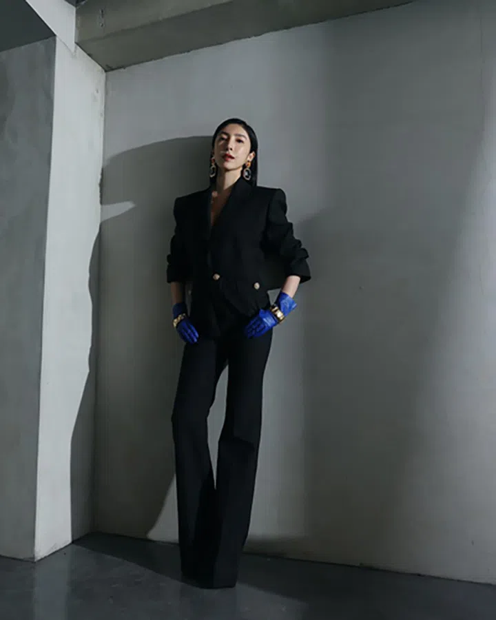 相对于其他穿着性感礼服的女星,杨谨华则以超飒Saint Laurent连体西装亮相。品牌极具标志性的亮色手套,为犀利黑装增添一丝时尚酷味,也让造型更加抢眼。