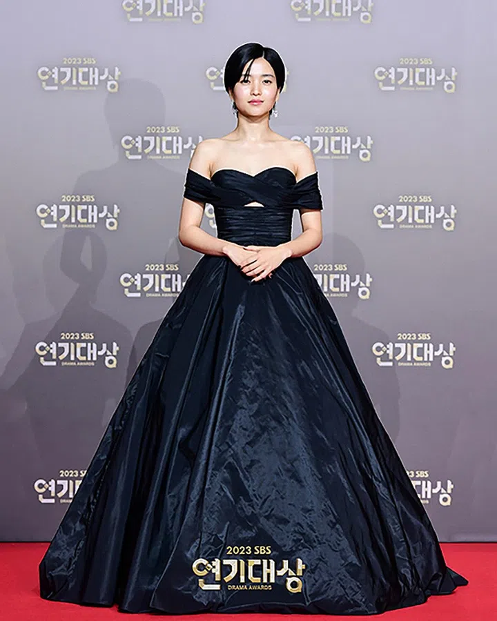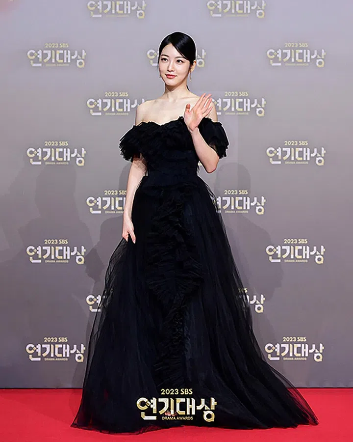 在《黑暗荣耀》中饰演高中时期邪恶女主的辛叡恩,当天穿着土耳其品牌Tarık Ediz的黑色薄纱露肩礼服,并搭配Buccellati耳坠,风格浪漫又有气场。