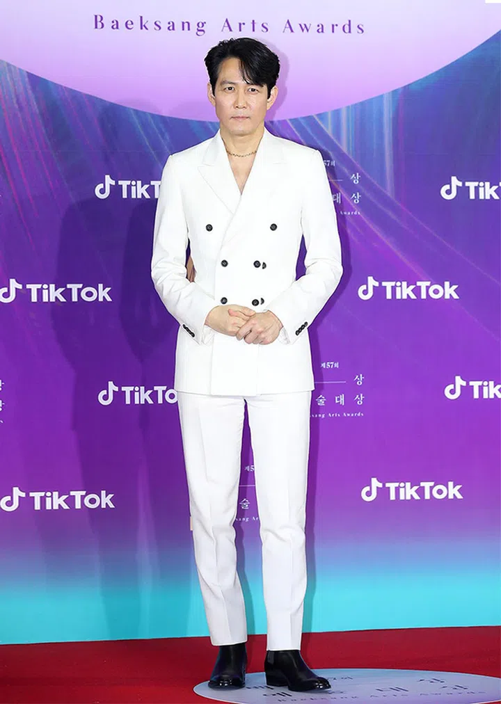 李政宰身穿Alexander McQueen 2021春夏系列白西装亮相《第57届百想艺术大赏》,无内搭衬衫,仅戴上铁质的项链展现熟男魅力。