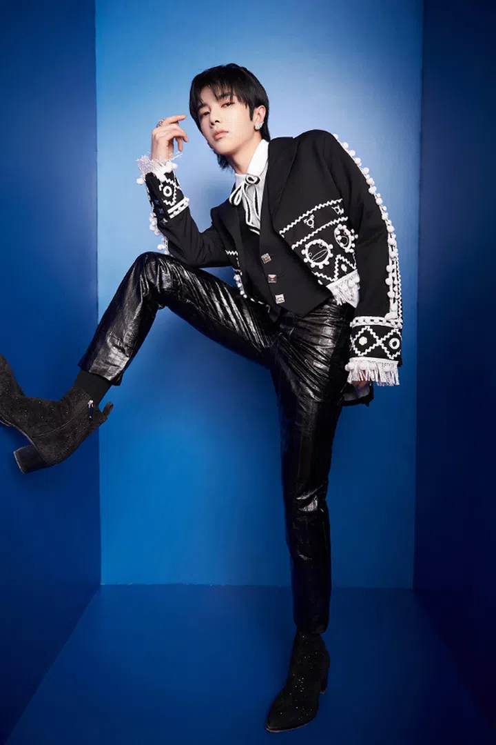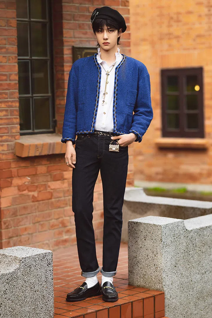 王一博每每出席各大活动和典礼几乎都穿Chanel,算是中国男版“行走的Chanel”。微博之夜,他以品牌2021春夏系列的蓝色花呢外套+荷叶领衬衫,搭配牛仔裤及贝雷帽,穿出复古华丽的宫廷风。
