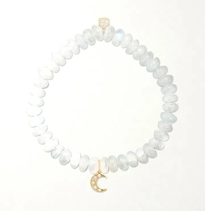 月光石不仅是六月的诞生石,也是天蝎座的幸运石。而且传说月圆的时候佩戴月光石能遇见好情人,因此也是爱情的象征。这款月光石手链装饰一弯浪漫的峨眉月,仿佛好事就要发生哦。
