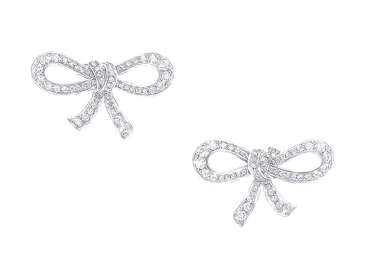 4月的诞生石,是我们最为熟悉的璀璨钻石。它象征着贞洁与纯净,还是结婚75周年的纪念宝石。所以,75周年婚姻也称“钻石婚”。这对设计精巧的蝴蝶结钻石耳坠,以立体逼真的设计,展现出如刚刚手系而成的效果,显得格外灵动。