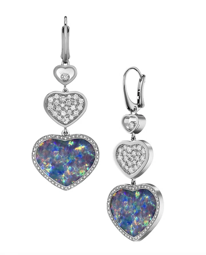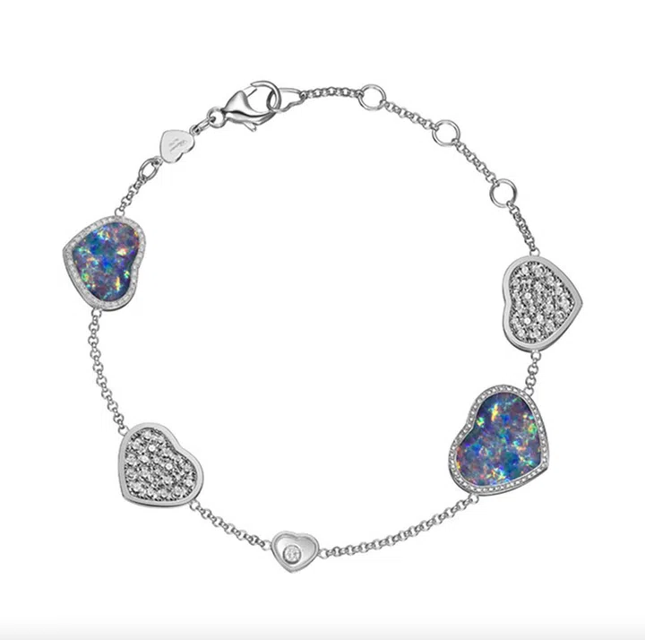该手链有珍珠贝母、孔雀石等不同材质心形装饰手链,其中幽蓝色调组合钻石的欧泊款式最给人梦幻美感,神秘又魅惑。而且,欧泊还经常被比喻成纯洁又多彩的爱情,因此也有“丘比特石”之称。