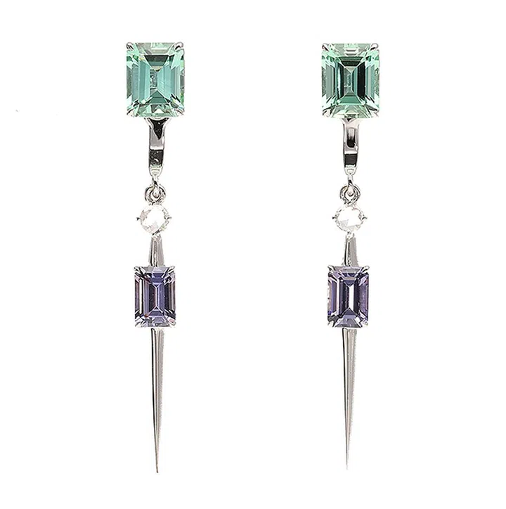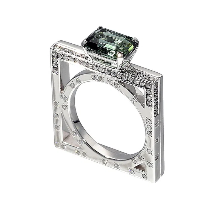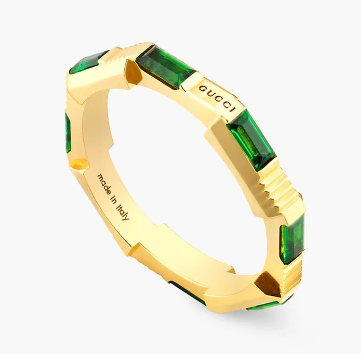 这款戒指结合阳刚之气及浪漫女性美,装饰baguette切割的绿色碧玺,风格现代且便于叠搭,佩戴方式也更加多样。