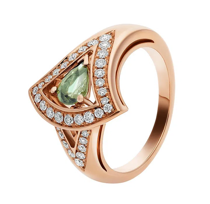 Divas' Dream系列也有装饰碧玺的精美首饰,这款镂空设计戒指镶嵌绿色碧玺——而碧碧不同颜色也有不同含义,比如绿碧玺就代表着希望和生命,也有招财的吉祥意义。