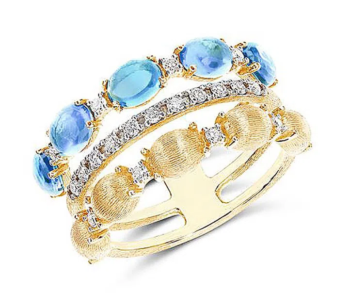 另外,蓝色托帕石的颜色也让人联想到天空和大海,能给人深邃、神秘的感觉。这款戒指造型通透又有层次感,制造出叠搭的视觉效果,同时色调和谐,抢眼但不浮夸。