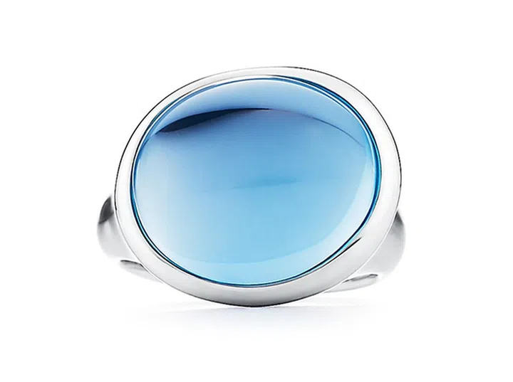 托帕石可以呈现出多种多样的缤纷颜色(如无色、浅蓝、粉紫、橙红等),所以托帕石也常常简单地通过其颜色命名,比如蓝色托帕石或黄色托帕石。其中蓝色托帕石透明度高、净度好、颜色艳丽。例如推荐的这款纯净如湖水的Tiffany戒指,设计简单又格外迷人。
