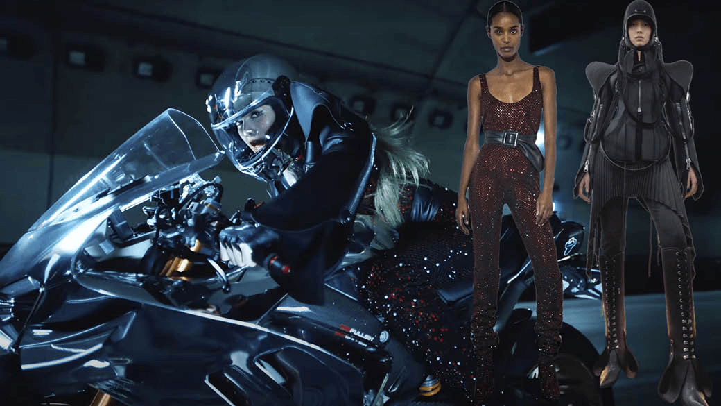 Lisa在MV中还有一段未来感十足的骑摩托车画面,爱车之人或许能认出这是Ducati的摩托吧。与之完美搭配的,则是来自Robert Wun 2021年秋冬系列的夹克,以及Alexandre Vauthier 2021春季高级定制系列的一件式jumpsuit。