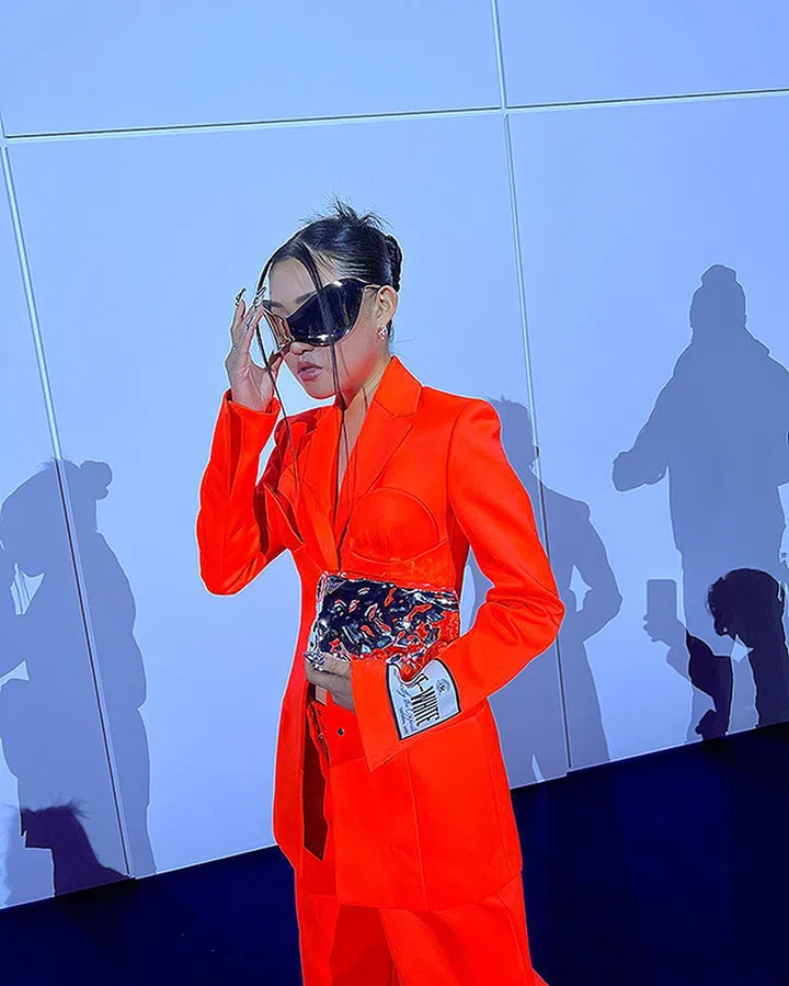 Jaime出席Paris Fashion Week 2023春夏时装周Off-White大秀,穿着橙红色调的西服套装亮相,在现场一片蓝色背景中格外抢眼,哪怕在模特秀图的模糊背景中都能认出她来。