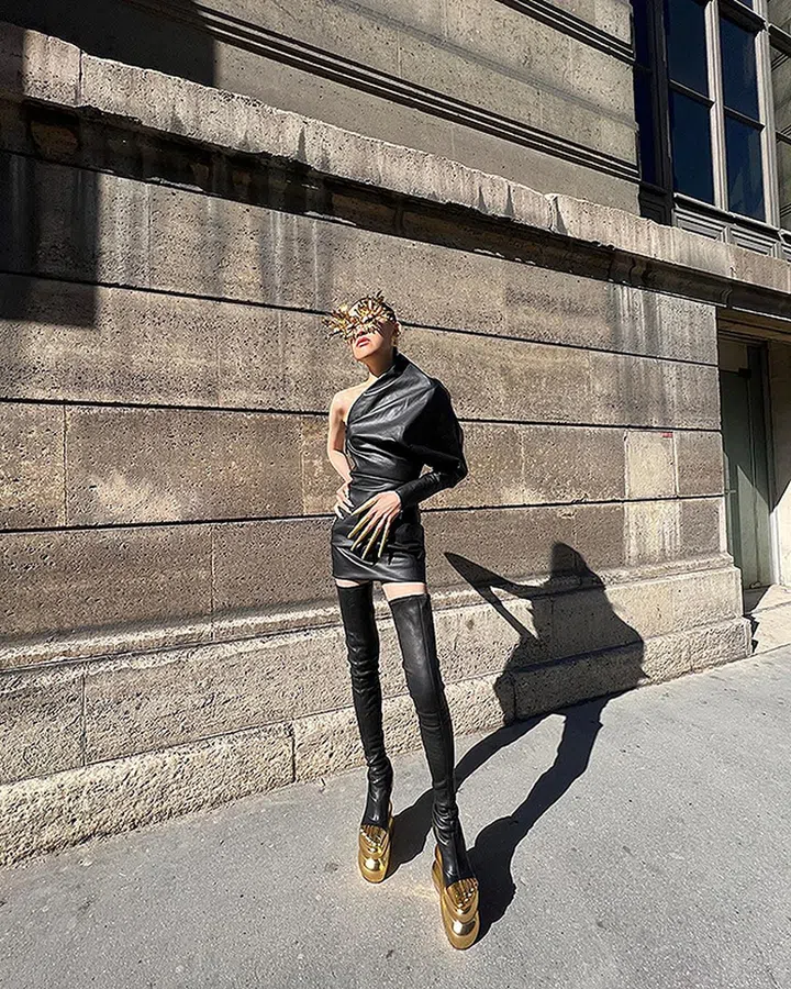 Jaime也是Schiaparelli的拥趸,而且她表示自从美国设计师Daniel Roseberry加入Schiaparelli,她每一季都很期待。其中这个造型的流动金属感皮革长靴,与其金色首饰相呼应(品牌也有finger ring、finger bijoux和toes bijoux等指套设计),展现出超现实的大胆时尚风格。