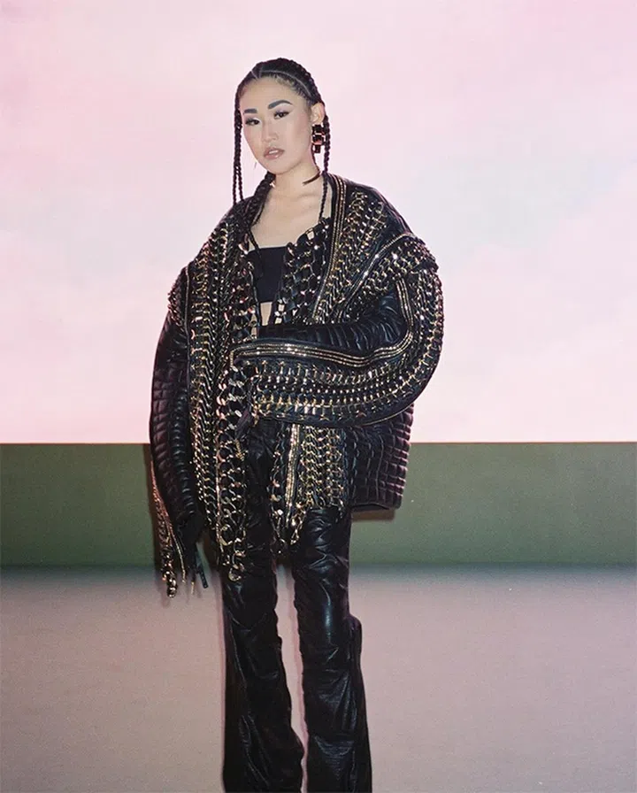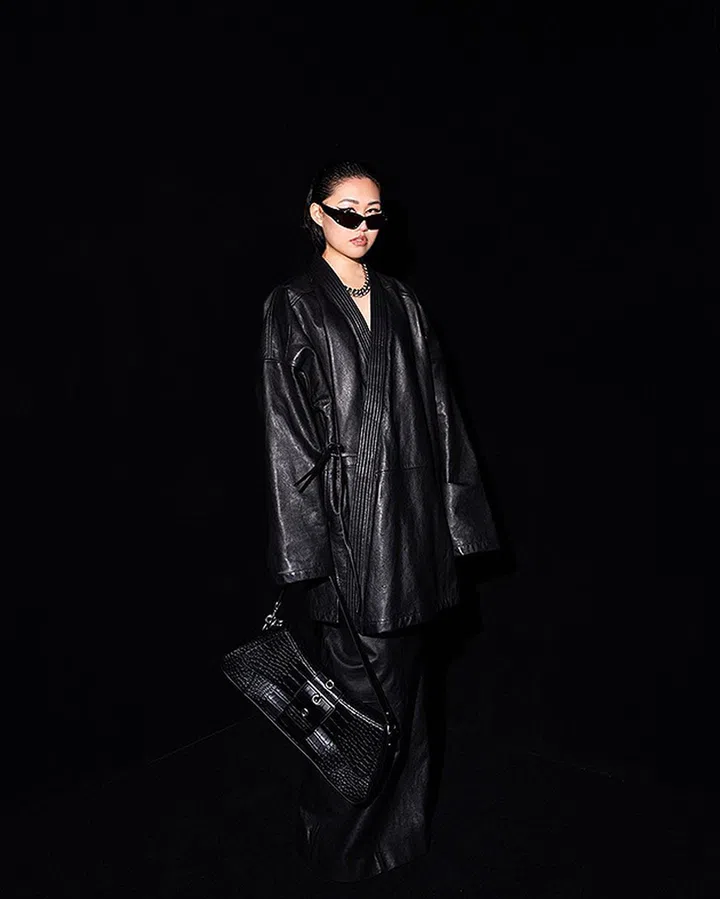 Jamie也是Balenciaga铁粉,这身造型是来自品牌秋季系列的Karate皮衣及皮裙——将空手道服化作皮革服饰,长裙也让人联想到和服设计,创意本身就很有趣。