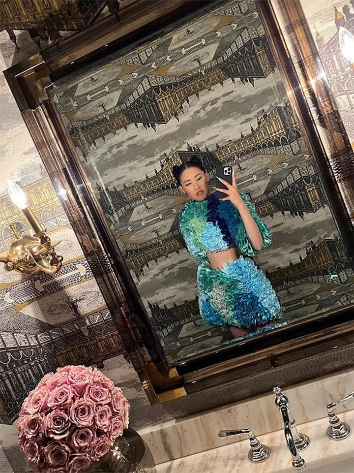 Jaime Xie有着高挑纤细的身材,穿上这身来自Marc Jacobs的连身衣搭配低腰印花长裙,贴身廓形和小露性感的挖洞设计完美呈现自身优势。典雅的Chopard花卉项链和耳坠,加上皮革手套的点缀让造型流露出一丝清新的富贵感。