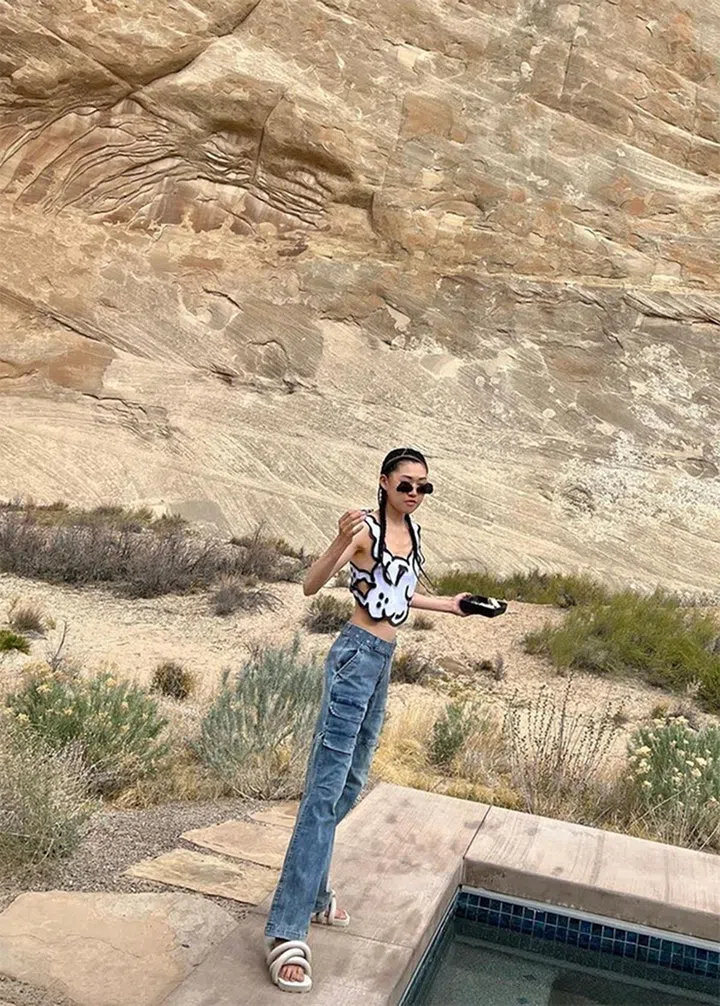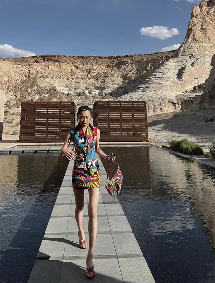 灼热的太阳底下,Jaime穿着的多彩Vintage Dior显得格外耀眼,满满的视觉冲击再次印证Jaime鲜明的前卫风时尚风格。