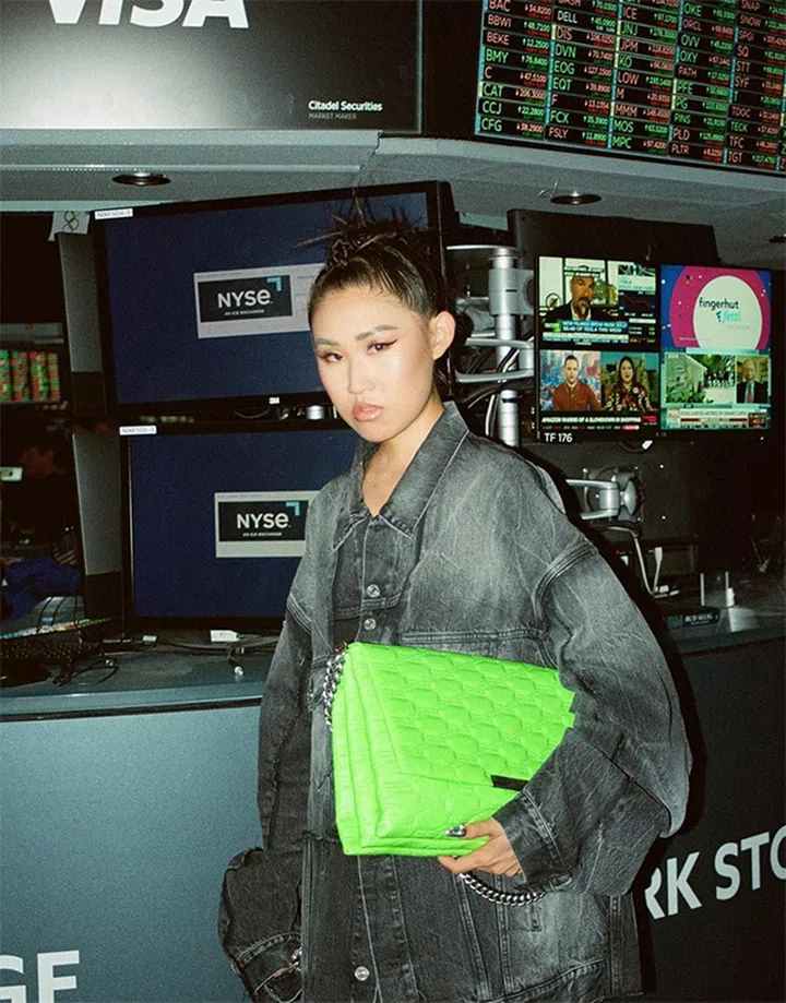 Balenciaga春季2023大秀在美国NYSE (The New York Stock Exchange)举行,Jaime身为品牌好友,穿上了宽廓形牛仔上衣和长裤套装出席,盘起的头发及犀利的眼线都在“明示”自身对街头时尚的热爱。Jaime手上拎的绿色包包是Balenciaga Triplet XL手袋。
