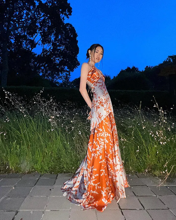 除了帅气、前卫的先锋造型,Jaime也能演绎柔美的feminine裙装。比如这款花卉图案的Silvia Tcherassi maxi dress,采用纤细挂脖设计和鱼尾裙摆,风格浪漫且具古典美。