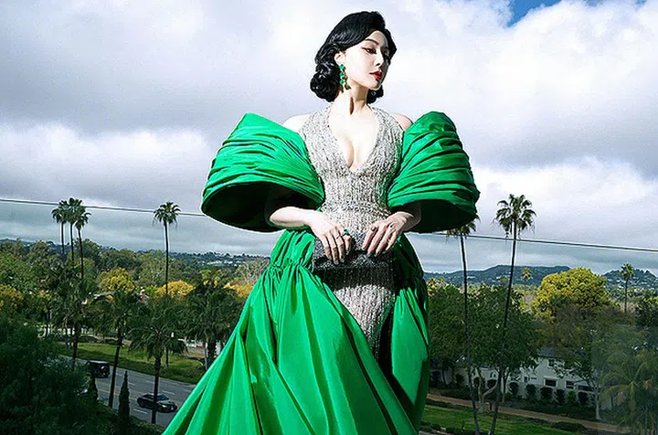 早前范冰冰暌违10年再度现身奥斯卡红毯,穿着黎巴嫩设计师Tony Ward的2023 春夏系列高级定制深V礼服。超璀璨的华丽裙装,搭配立体感十足的绿色拼接裙饰。礼服的大露背设计不仅优雅迷人,裙装的挂脖设计从背后看还如佩戴了钻石项链一般精致。搭配她的复古名伶妆发,展现高贵典雅的东方气质。