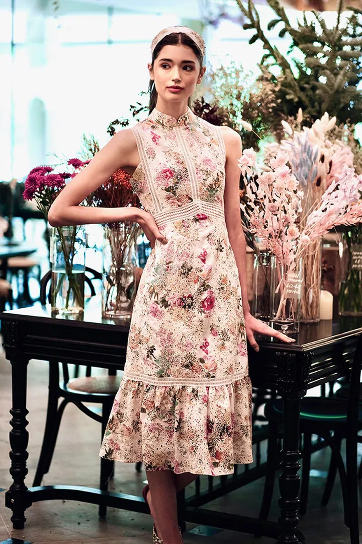 品牌Cloth.ier专为追求时尚个性与功能性的现代女性而设计,中西合并的设计也满足了欣赏中华服饰、艺术和文化的知性女性。这身经典的旗袍廓形以单色系花卉印花点缀着,苗条的身线透过贴身的剪裁展现出女性典雅的魅力,配上一双红色高跟鞋就是恰到好处。