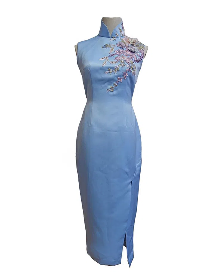简简单单的一件旗袍,不需太多的缀饰也能穿出华丽感。贴身的剪裁设计搭配肩上的花卉立体刺绣,精简中带有些思情画意。背面的挖洞设计更是流露出东方女性的小性感,高雅大方。